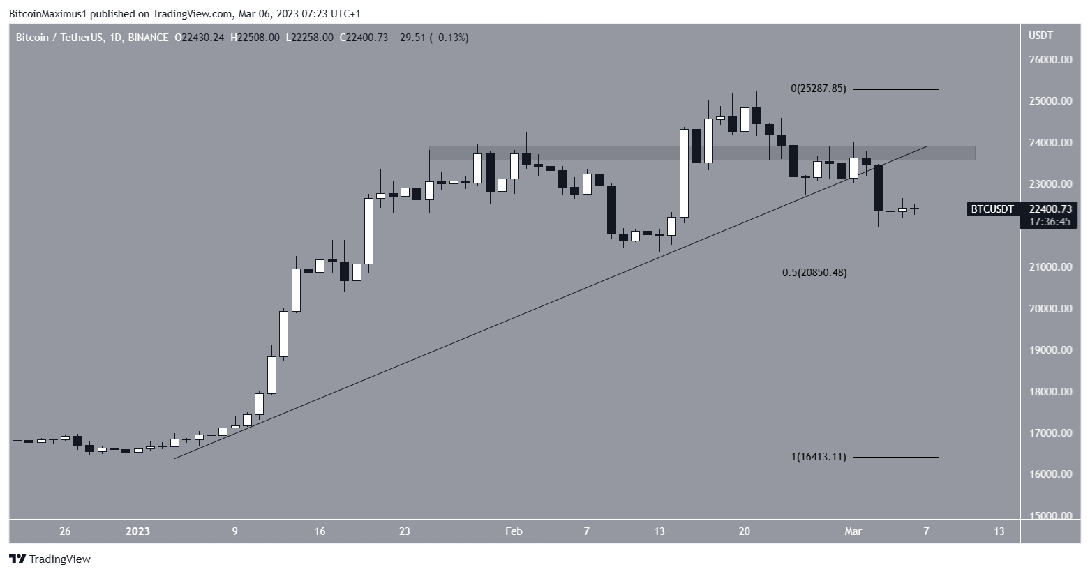ارتفع سعر بيتكوين BTC إلى خط الدعم التصاعدي منذ بداية هذا العام، وأثناء ذلك ارتفع السعر فوق منطقة المقاومة 23800 دولار.