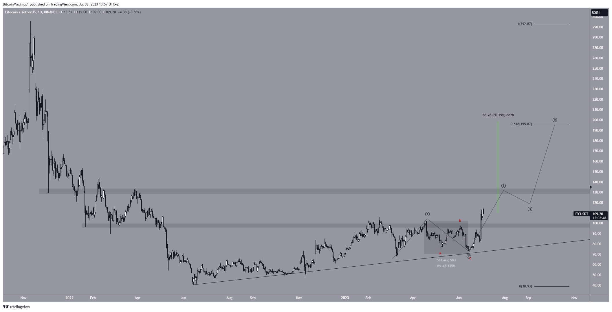 وإذا كان العد صحيحًا، فإن سعر اللايتكوين LTC قد بدأ الموجة الثالثة، كما يتضح من الاختراق فوق منطقة المقاومة 95 دولار.