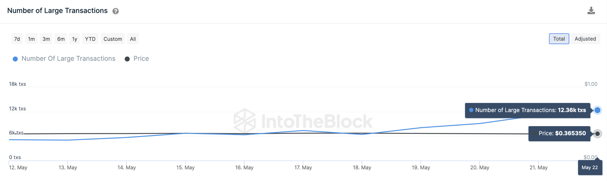 وتقيس المعاملات الكبيرة عدد المعاملات اليومية التي تتجاوز 100000 دولار. وهي المرة الأولى التي ينشط فيها حيتان العملة منذ مايو 2021.