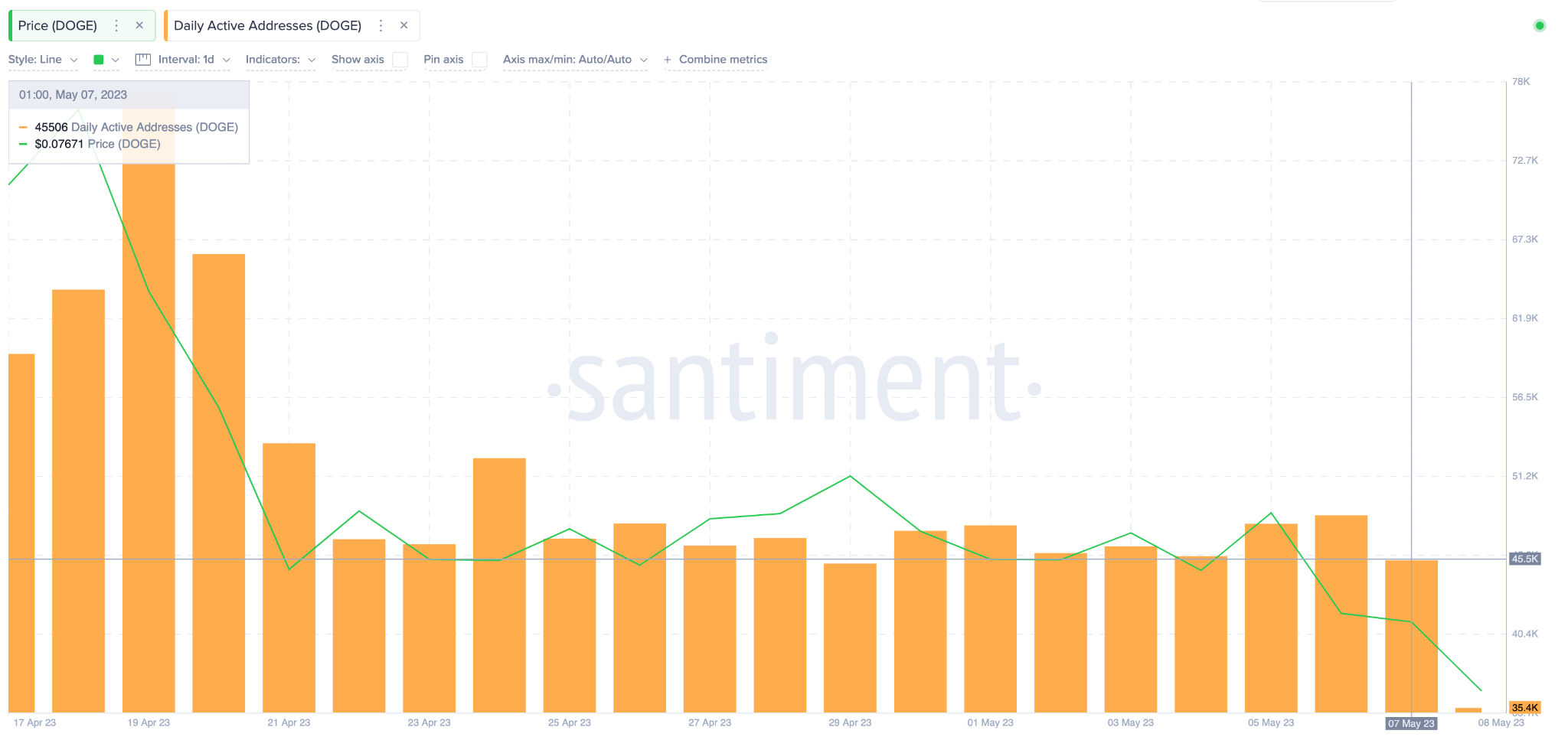 وفي الفترة بين 19 أبريل و 7 مايو انخفض عدد مستخدمي الدوج بنسبة 41% من 77325 إلى 44506 وفقًا لبيانات السلسلة. ومع استمرار المستثمرين في الانصراف إلى الأصول البديلة قد تشهد عملة الميم المزيد من التراجع في الأسعار.
