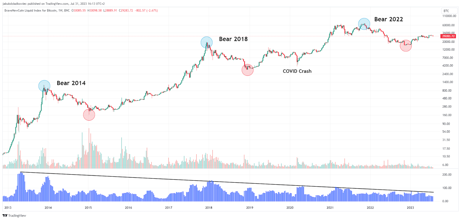وعلى الرغم من ذلك، فإن مخطط HV الأزرق في اتجاه هبوطي واضح. حيث تتبع قممه المنخفضة بشكل متزايد خط المقاومة التنازلي (الأسود). ويشير هذا إلى أنه على الرغم من استمرار دورة التنصيف لمدة 4 سنوات، فإن تقلب البتكوين آخذ في الانخفاض.