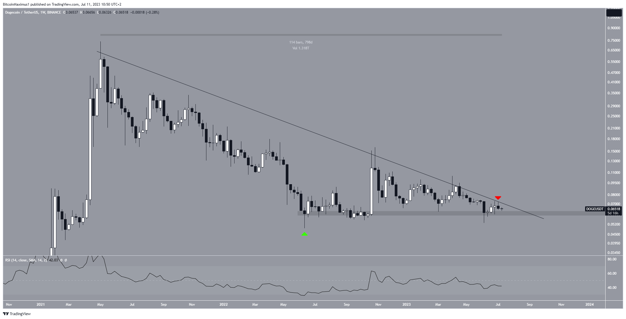 وفقًا للتحليل الفني للإطار الزمني الأسبوعي، يُلاحظ أن سعر الدوج قد انخفض إلى ما دون خط المقاومة الهبوطي بعد الوصول لأعلى المستويات عند 0.739 دولار في مايو 2021. وقد أدى هذا الانخفاض إلى انخفاض قدره 0.049 دولار في يونيو 2022.