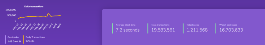 كما أكملت الشركة نحو 19.58 مليون معاملة وعالجت 1.2 مليون كتلة وقت نشر هذا الخبر. ويبلغ متوسط وقت الحظر نحو 9.8 ثانية، بينما تزيد عناوين محفظة الشبكة عن 16.7 مليون.