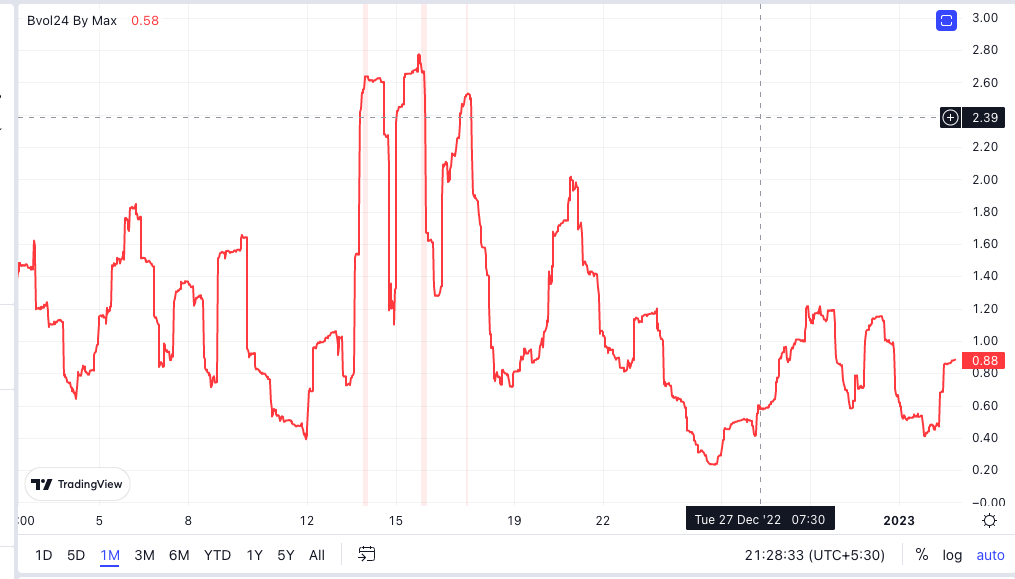 كما أشار تقرير سابق للموقع الإخباري كوينتيليغراف، إلى تقلبات البيتكوين من الوصول إلى مستويات قياسية جديدة في الفترة التي سبقت نهاية العام، استنادا إلى مؤشر التقلب التاريخي لعملة البيتكوين (BVOL) Bitcoin historical VOLatility index.