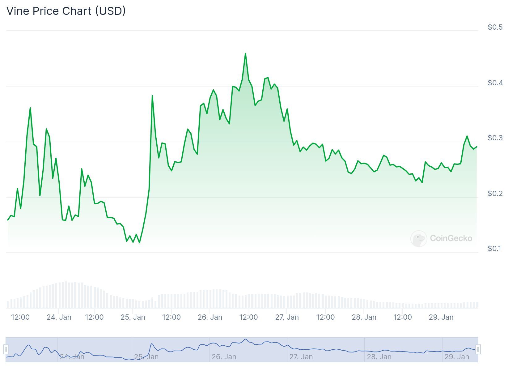حاليا، كان سعر VINE يبلغ 0.2563 دولار، حسب بيانات CoinGecko، مسجلًا ارتفاعًا بنسبة 33% خلال 24 ساعة. كما حقق أعلى مستوى تاريخي له (ATH) عند 0.4194 دولارًا يوم 23 يناير.