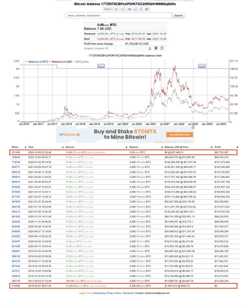 صاحب هذه المحفظة اشترى هذه العملات في السابع من مايو 2016. عندما كانت قيمة بيتكوين تعادل 459 دولارًا للعملة الواحدة. و قد كلّفه هذا الاستثمار في ذلك الوقت حوالي 37 مليون دولار.