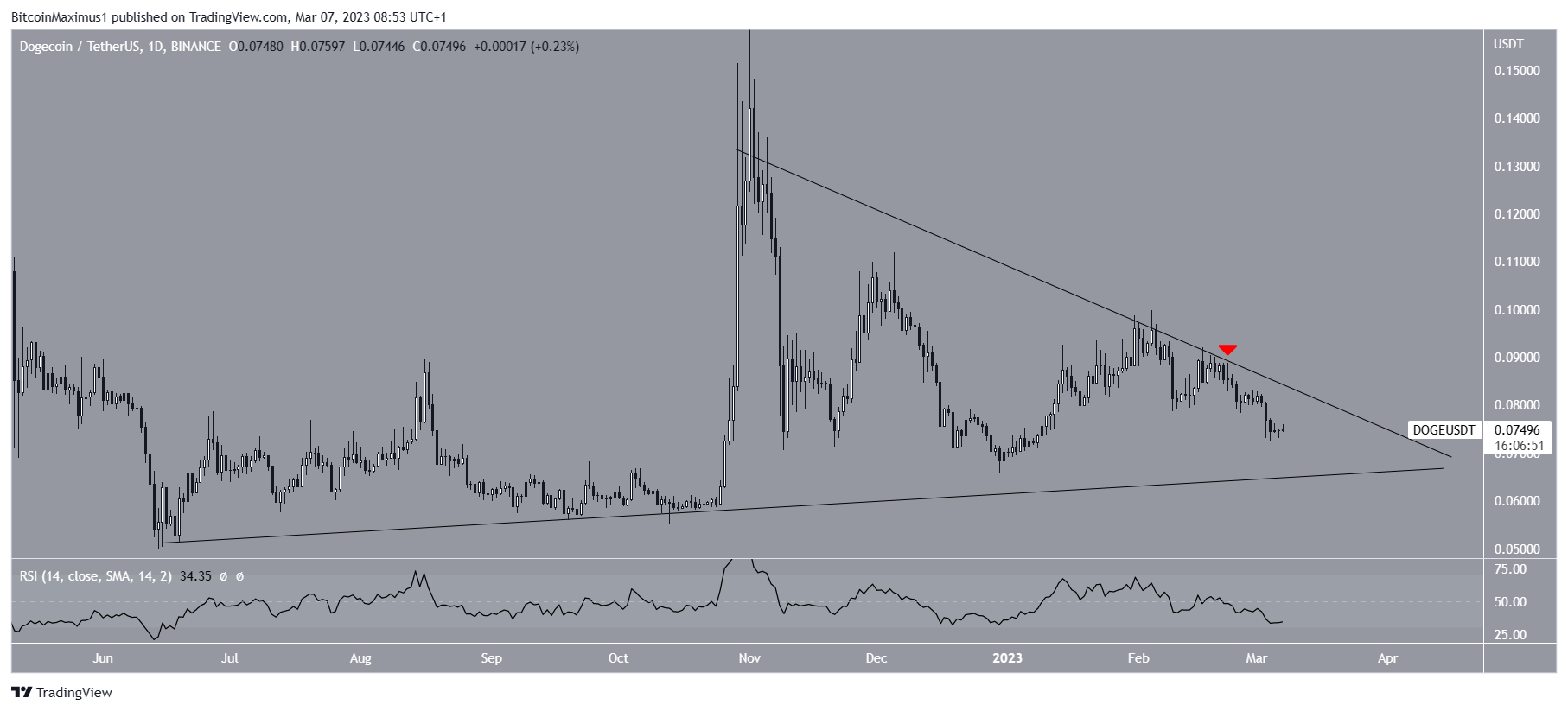 وانخفض سعر الدوج داخل مثلث متماثل منذ يونيو 2022، حيث تسبب هذا المثلث في العديد من الرفض في فبراير، كان أخرها في الثاني والعشرين من فبراير (رمز أحمر).