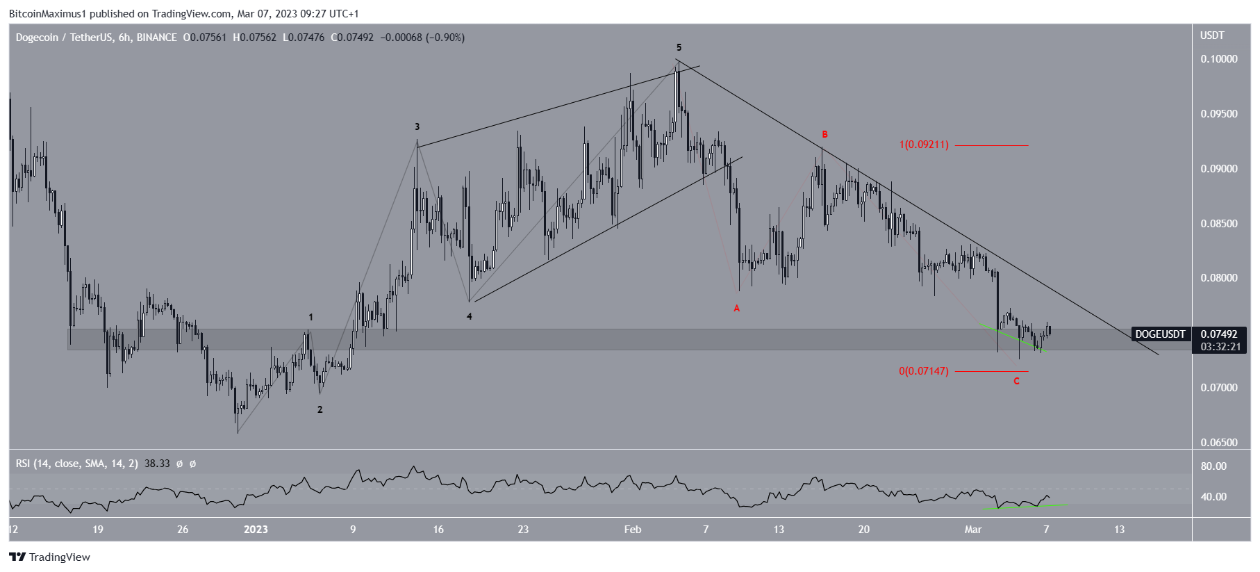حيث إكمال سعر دوج كوين لحركة تصاعدية من خمس موجات (سوداء)، يتبعها هيكل تصحيحي ABC (أحمر).