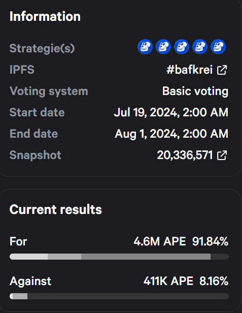 على الرغم من هذه المخاوف، تم إدلاء حوالي 5 ملايين رمز APE كأصوات، مع دعم 4.6 ميلون رمز (92% من المجموع) للاقتراح. من الجدير بالذكر أن عنوانًا واحدًا، 0xC602، مسؤول عن 67% من أصوات النعم، مساهمًا بـ 3.1 مليون رمز APE.