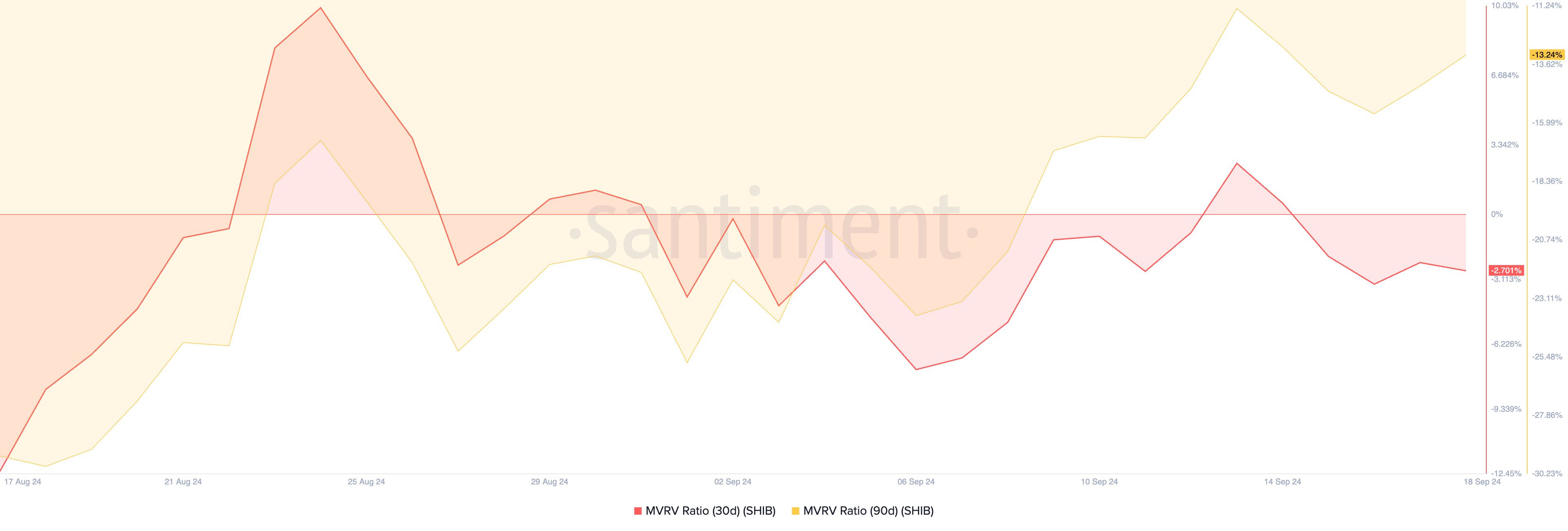 في وقت كتابة هذا التقرير، تبلغ نسب MVRV لـ 30 يومًا و90 يومًا لعملة SHIB -2,70 و-13,24 على التوالي، مما يشير إلى أن قيمتها الحالية أقل من متوسط سعر جميع الرموز المتداولة. تاريخيًا، هذه إشارة شراء، حيث يمكن للمستثمرين تجميع الأصل بسعر منخفض وأمل بيعه بقيمة أعلى.