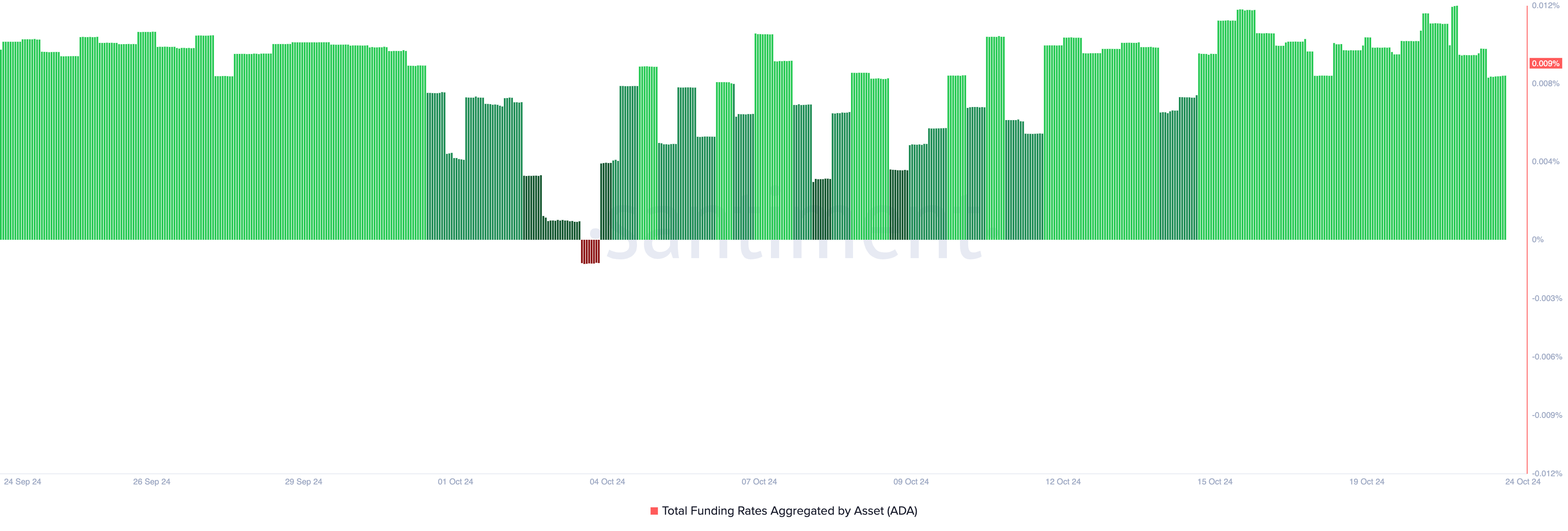 من المثير للاهتمام، لا يشارك جميع متداولي المشتقات لـ ADA هذا المعنى. يشير معدل التمويل الإيجابي عبر بورصات العملات المشفرة إلى أن العديد من متداولي العقود الآجلة يواصلون فتح مراكز داعمة لارتفاع الأسعار. في وقت كتابة هذا التقرير، يبلغ معدل التمويل 0,009%.