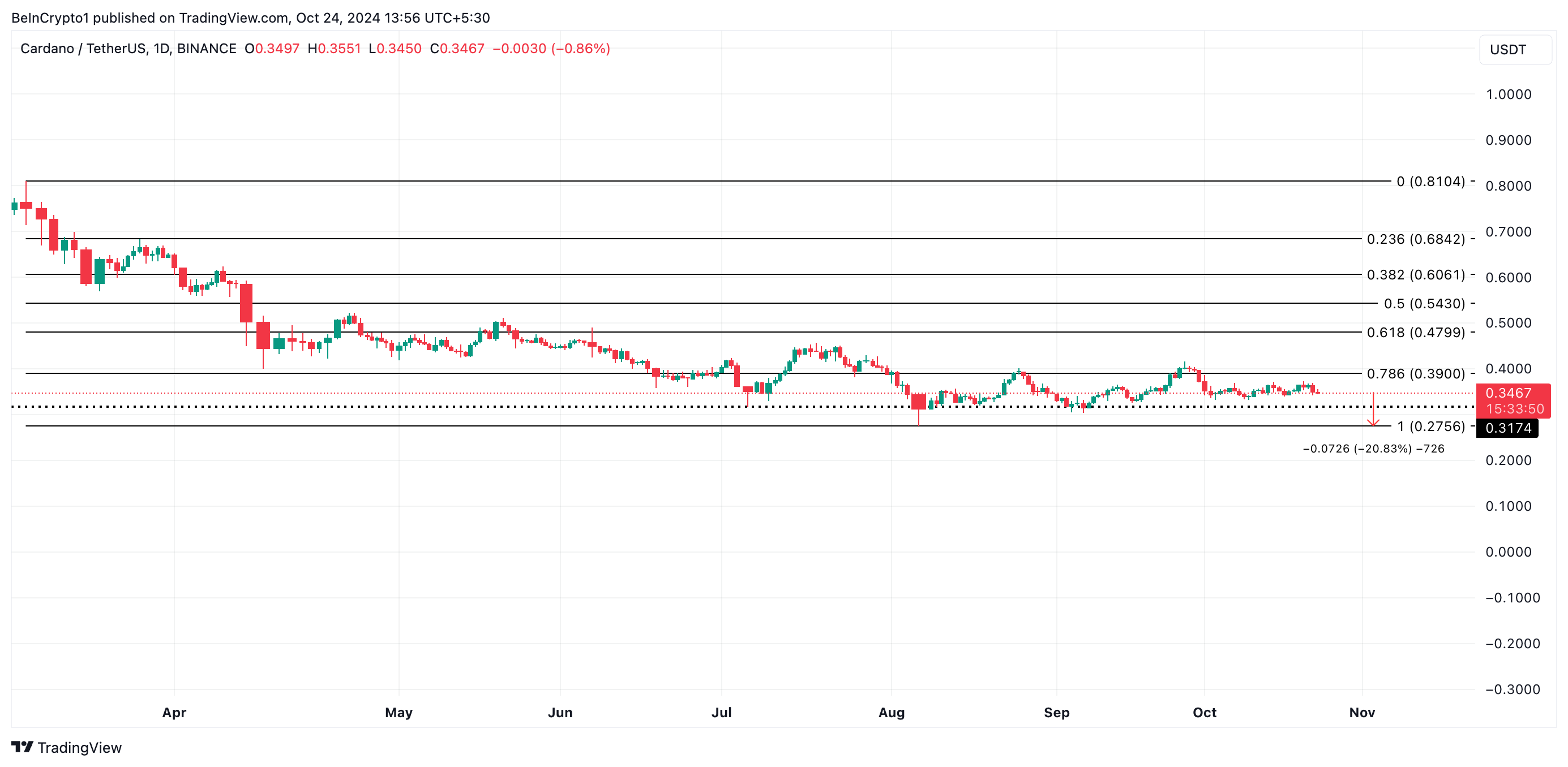 يتداول الكاردانو بسعر 0,34 دولار، فوق مستوى الدعم الحاسم البالغ 0,31 دولار. هذه النقطة السعرية مهمة لأنها نقطة رئيسية بين القيمة الحالية للكاردانو وأدنى مستوى له في 5 أغسطس والذي كان 0,27 دولار. إذا تزايدت ضغوط البيع وفشل الثيران في الدفاع عن هذا الدعم، فقد يصبح انخفاض بنسبة تصل إلى 21% إلى أدنى مستوى في 5 أغسطس أمرًا لا مفر منه.