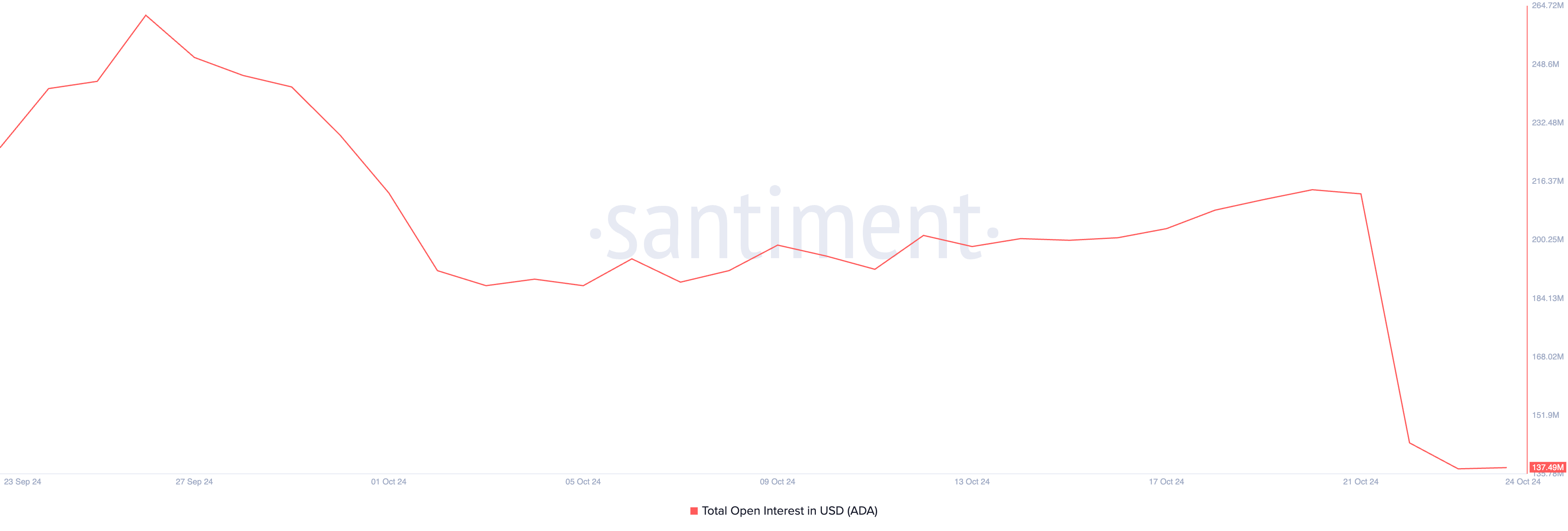 في وقت كتابة هذا التقرير، بلغت الفائدة المفتوحة للعملة 138 مليون دولار، بانخفاض قدره 35% في ثلاثة أيام. خلال تلك الفترة، انخفض سعر ADA بنسبة 5%.