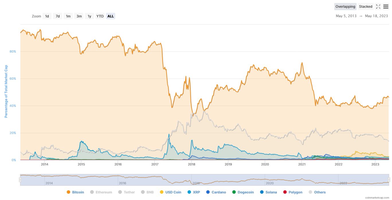 عملة بيتكوين استمرت في الهيمنة على أكبر نسبة من قيمة سوق العملات الرقمية المشفر بلغت 44.76% في الربع الأول من عام 2023. شهدت البيتكوين مكاسب كبيرة في حصتها في السوق خلال هذا الربع. حيث لجأ إليها المتداولون بكونها ملاذ ًا آمنًا حتى من العملات المستقرة بحثًا عن الأمان. بعد الإجراءات التي اتخذتها لهيئات الرقابية في الولايات المتحدة الأمريكية.
