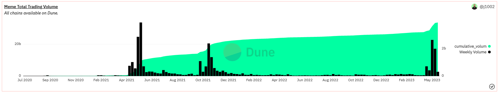 حسب بيانات منصة Dune في الأسبوع الأول من شهر مايو. ارتفع حجم التداول على عملات الميم إلى ثالث أعلى مستوى تاريخي بعد ذلك المسجّل خلال في عام 2021 في ذروة هيستيريا عملات الميم الثانية.