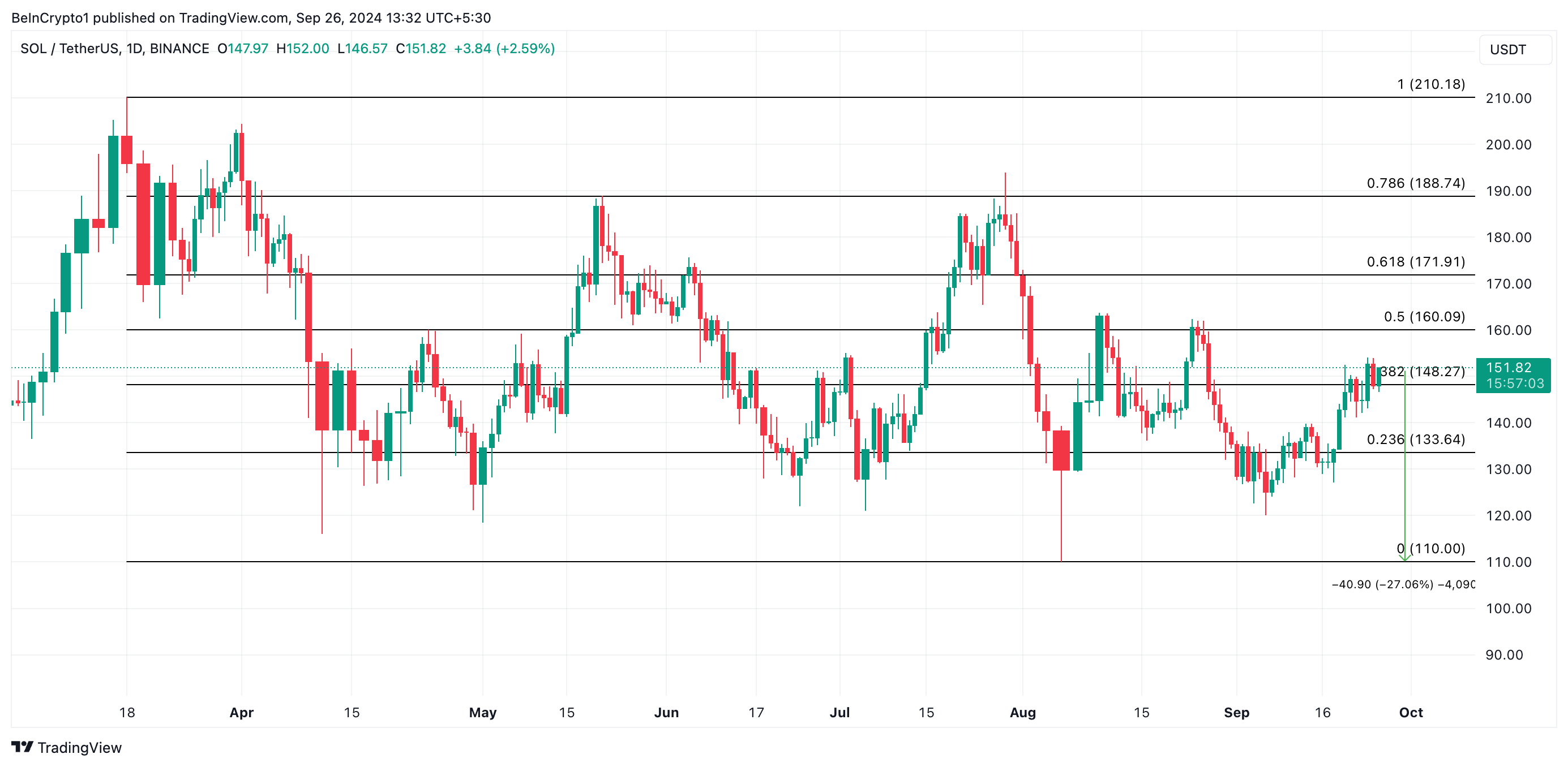 ومع ذلك، إذا استمر الحوت في تصفية ممتلكاته لتحقيق الأرباح، فقد تتكرر التاريخ. في هذا السيناريو، قد ينخفض سعر سولانا بنسبة 27%، ويتداول حول 110$.