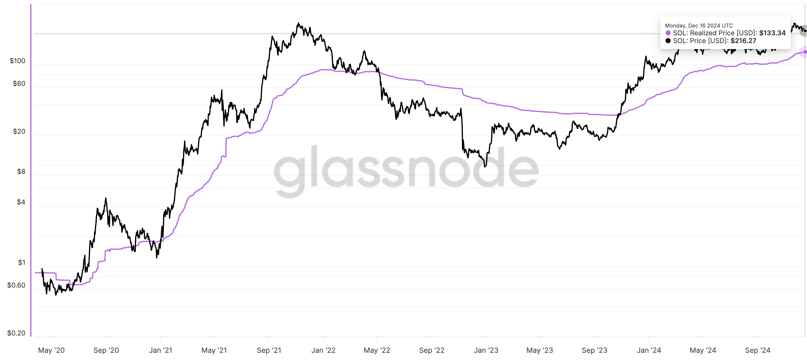يوفر هذا المقياس متوسط أساس التكلفة على السلسلة الذي تم شراء جميع الرموز به. عندما يكون سعر العملة المشفرة أقل من السعر المحقق، قد يحدث تصحيح. ولكن في هذه الحالة، سعر سولانا المحقق هو 133,34$، وهو أقل بكثير من السعر الحالي.