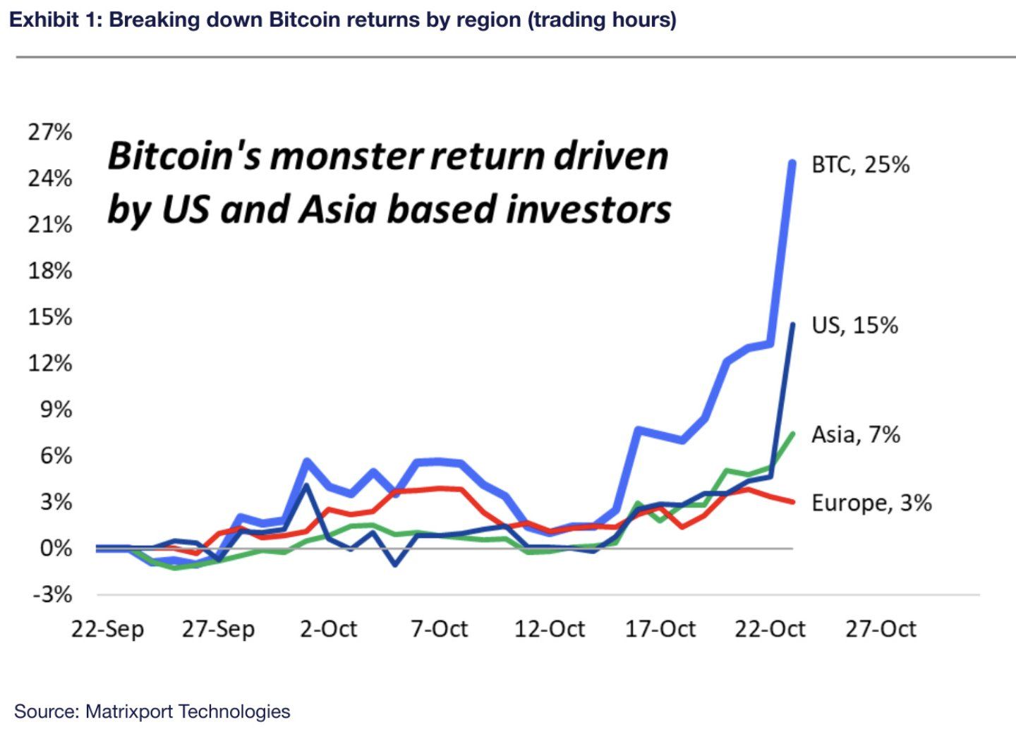 أفادت شركة خدمات العملات الرقمية المشفرة ماتركيس بورت Matrixport في ملاحظة يوم الأربعاء. أن أكبر عملة رقمية في العالم، بيتكوين (BTC)، قد ارتفعت بنسبة 25% في الشهر الماضي. وأن معظم هذه الزيادات حدثت خلال ساعات التداول الأمريكية.