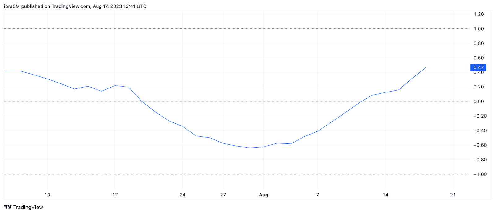 ويوضح الرسم البياني أدناه أن معامل الارتباط BTC / S & P 500 كان يتجه تصاعدياً في شهر أغسطس. ففي الفترة بين 1 أغسطس و 17 أغسطس، ارتفع من -0.65 إلى 0.47.