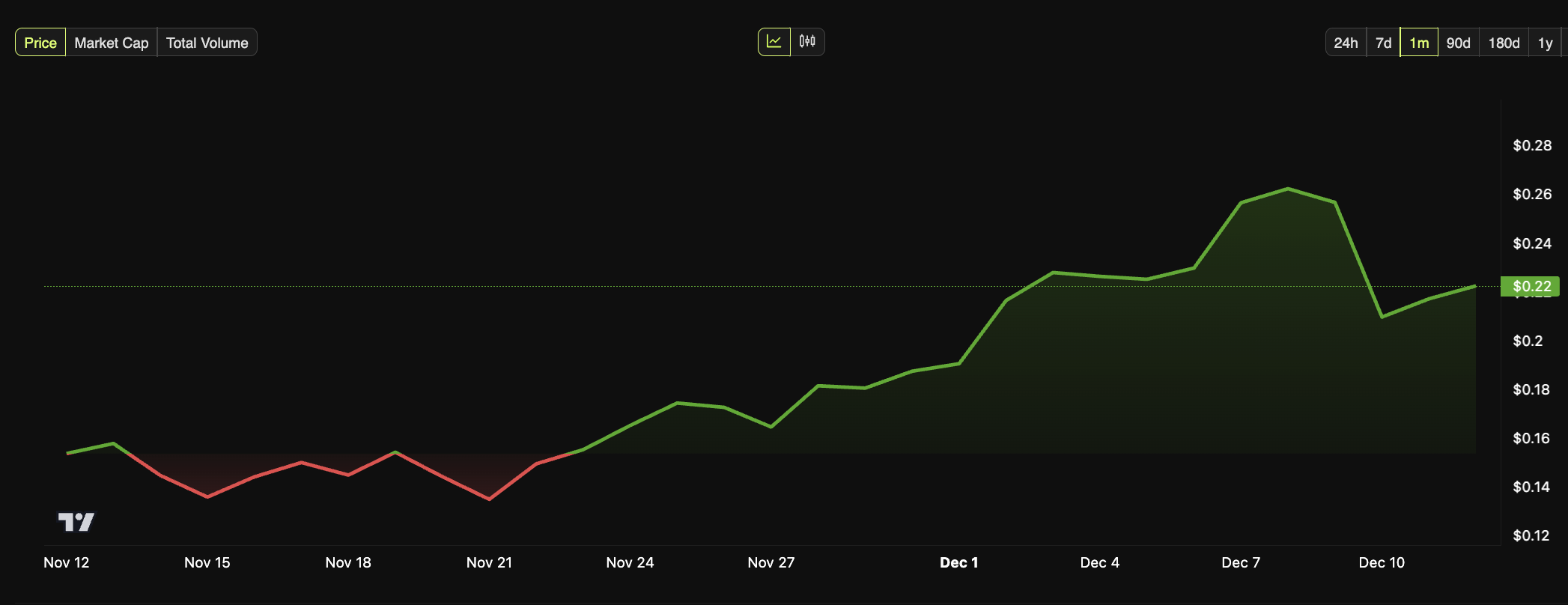 في 2024، زاد سعر دوجكوين بشكل كبير، حيث ارتفعت بنسبة 376% وبلغت ذروتها حوالي 0,43 دولار. هذا النمو يرمز إلى تأثير المشاركة المجتمعية والتأييدات البارزة على تقييمها. على الرغم من افتقارها لاختراقات تكنولوجية كبيرة، جذبت دوجكوين مرارًا جمهورًا عالميًا من خلال بساطتها وهوية مشتركة.