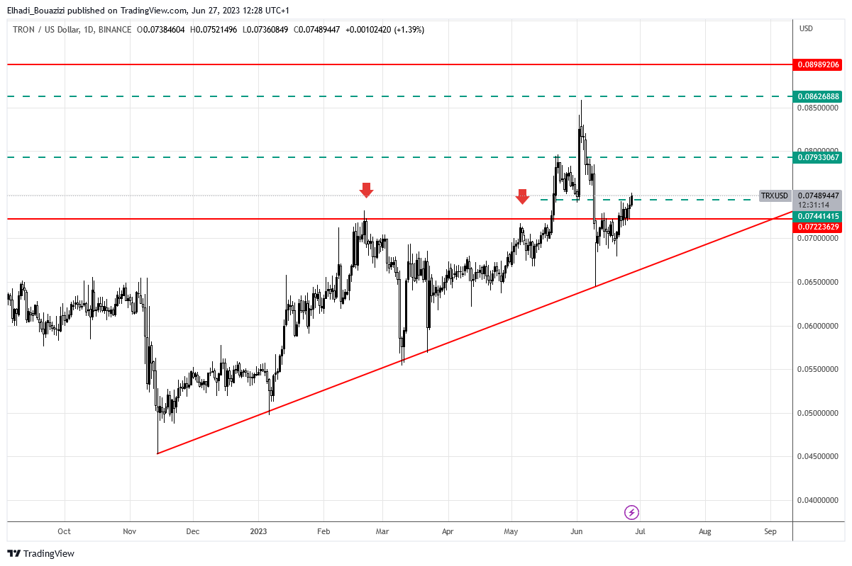 في حالة تمكن سعر TRX من كسر مستوى الدعم 0.744 دولار. فإن ذلك سوف يفتح الباب أمام المزيد من الصعود إلى 0.08 دولار ثم 0.085 دولار.
