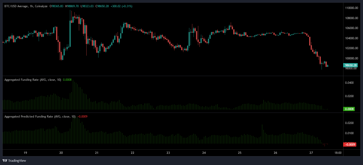 تحوّلت معنويات سوق البيتكوين (BTC) إلى التشاؤم، بحسب بيانات منصة coinalyze، تحولت معدلات تمويل عقود البيتكوين الدائمة سلبًا، ما يعني أنّ المتداولين باتوا يميلون إلى صفقات البيع على المكشوف توقعًا لمزيدٍ من الهبوط. تراجع البيتكوين لينخفض لفترة وجيزة إلى ما دون حاجز 98,000 دولار.