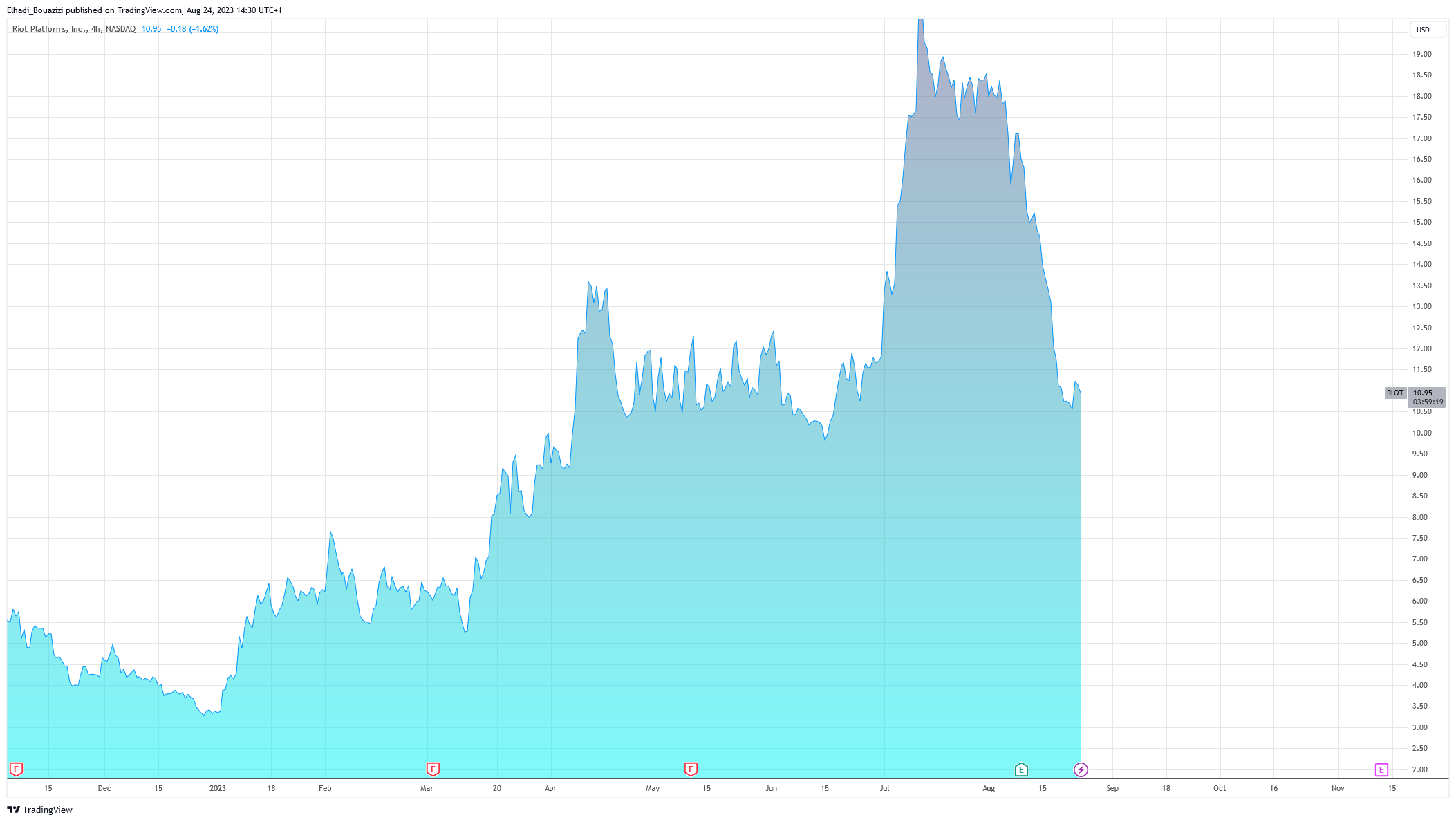 عند النظر إلى الرسم البياني لحركة سعر سهم شركة Riot Platform. نرى أن السعر اختبر أدنى مستوياته منذ أكثر من شهرين وقد انخفض بنسبة تقارب 50% من أعلى مستوياته في يوليو.