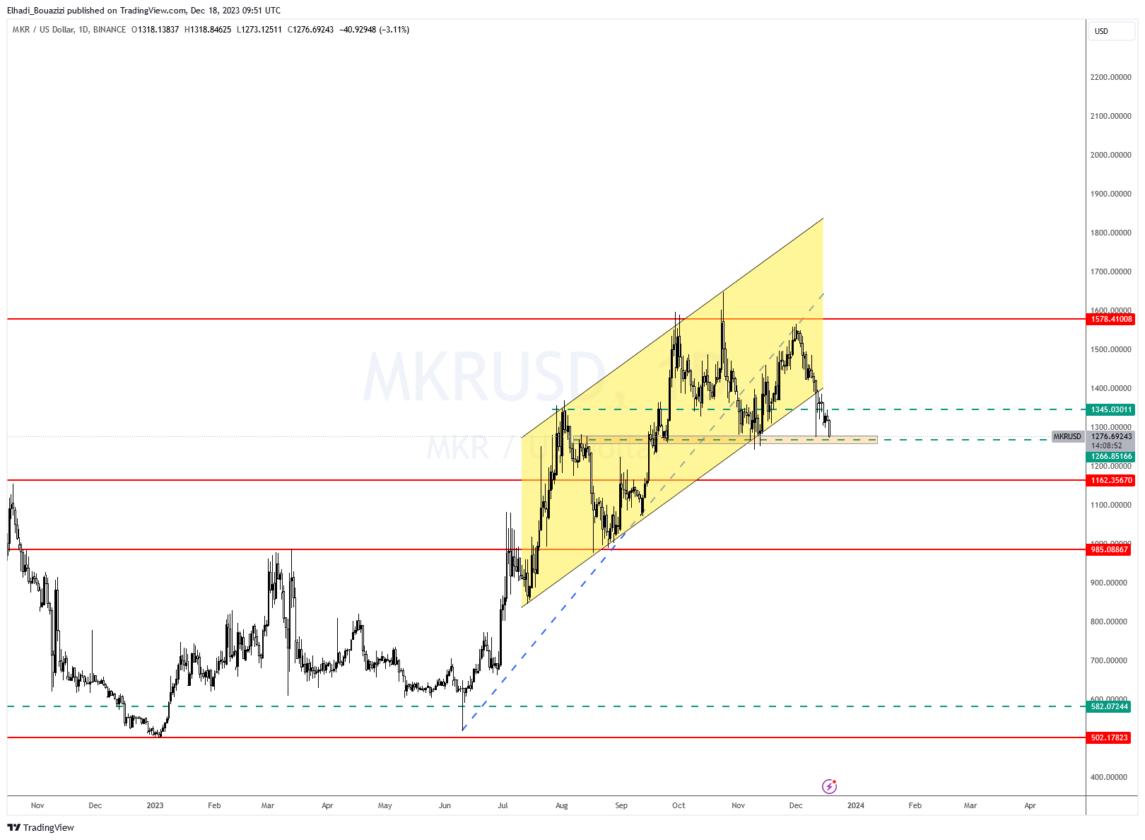 على الرسم البياني اليومي نلاحظ أن سعر عملة مايكر MKR قد كسر الحد السفلي للقناة السعرية الصاعدة التي كان يتداول داخلها منذ الصيف الماضي.