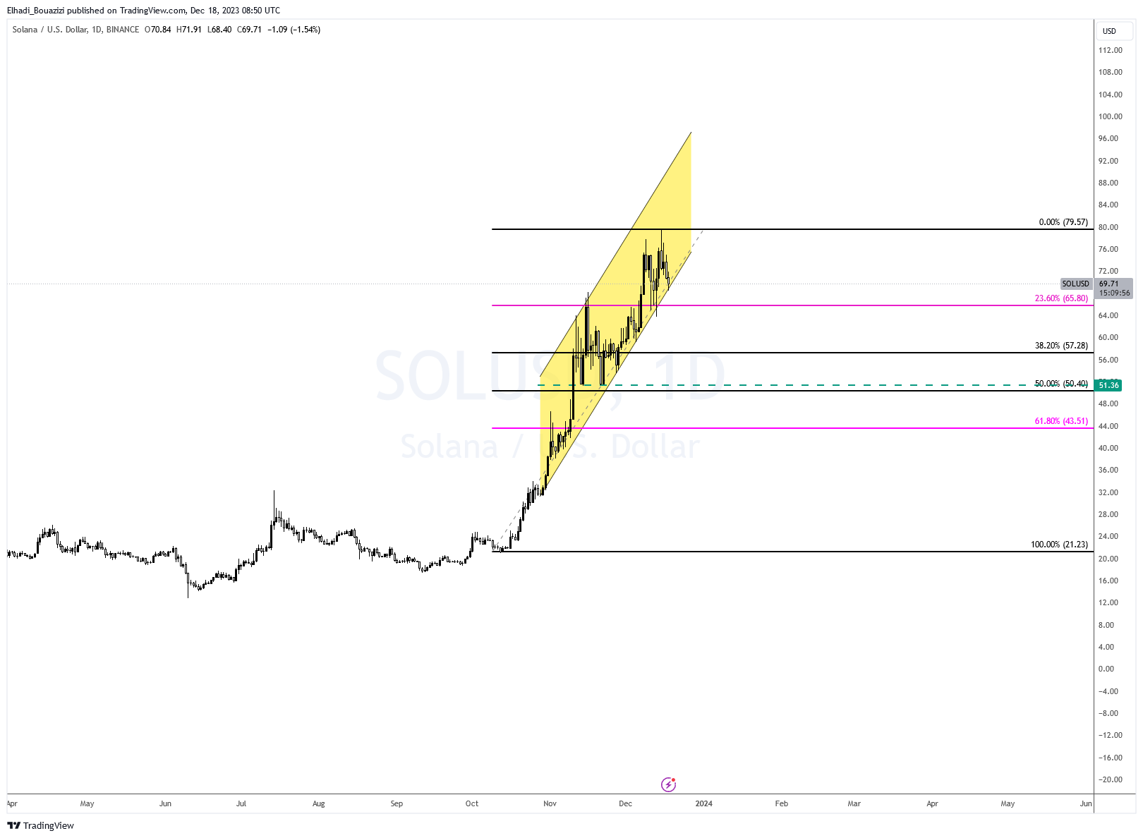 يتداول سعر سولانا SOL الآن في حدود مستوى 70 ولار عند الحد السفلي للقناة السعرية الصاعدة. من الصعب القول أنه سوف يترد من هذا الدعم أم لا.