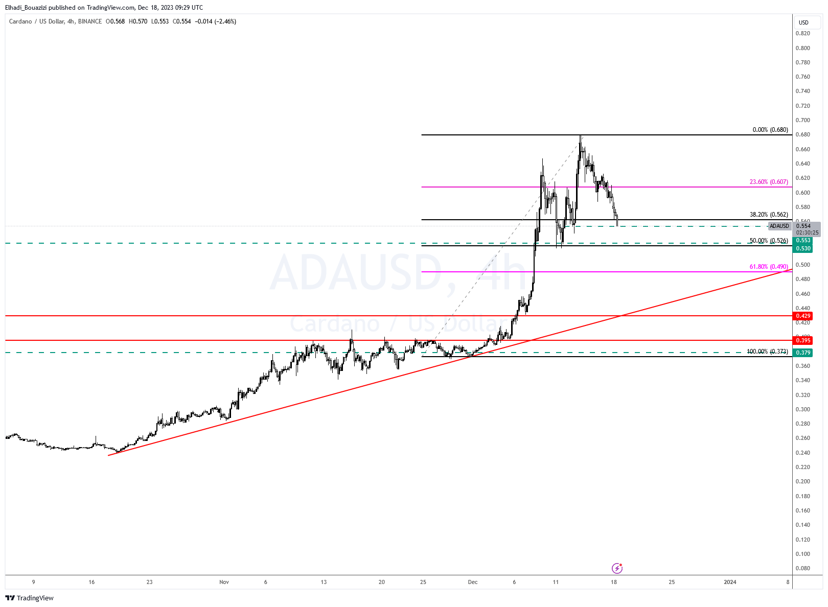 ثم بعد ذلك هناك مستوى تصحيح فيبوناتشي 61.8% عند سعر 0.49 دولار. حتى نصل إلى خط الاتجاه الصاعد الذي يمثل أقوى مستوى دعم.