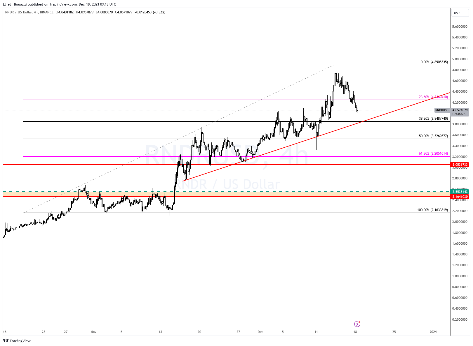 بلغ سعر RNDR ذروته عند 4.90 دولار، و هو الآن يتداول عند سعر 4.05 دولار. الهبوط إلى مستويات الدعم السابقة يمثل فرصة جيد للشراء.