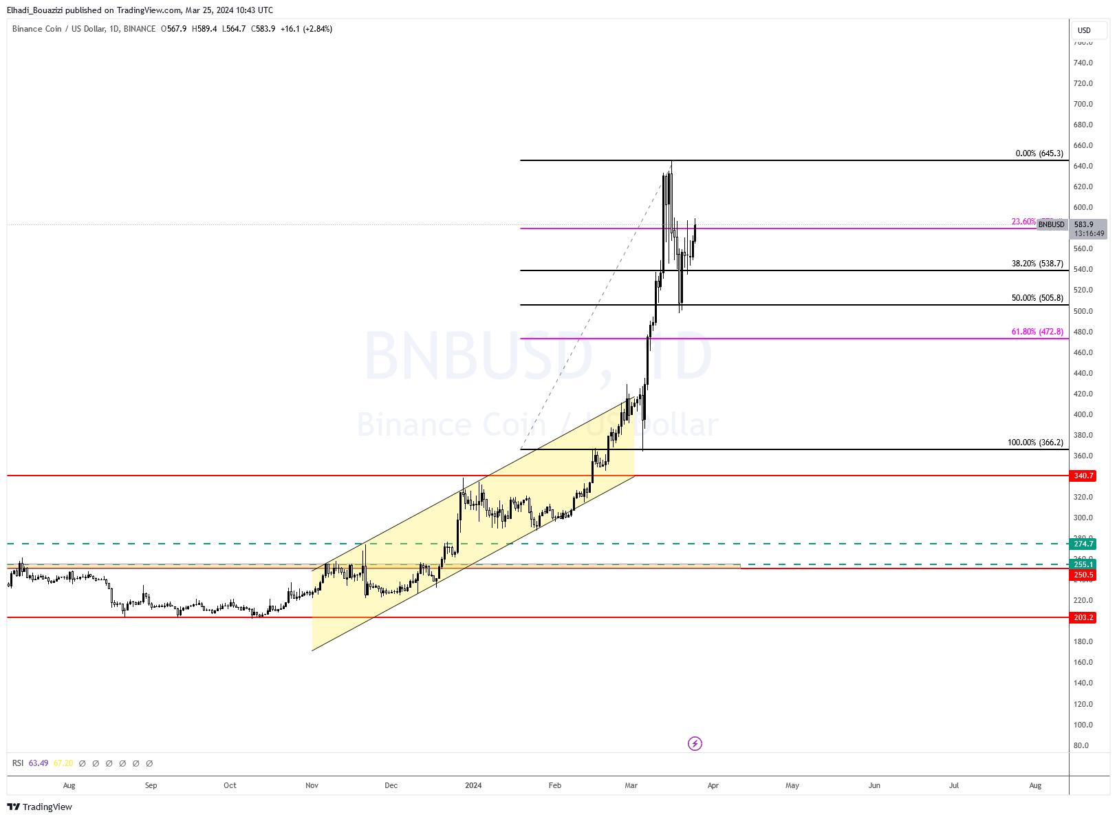 عملة بينانس BNB ارتفعت بحدّة مند بداية الشهر الجاري، و لقد صححت بنفس الحدة بعد أن بلغت قمة 645 دولار.