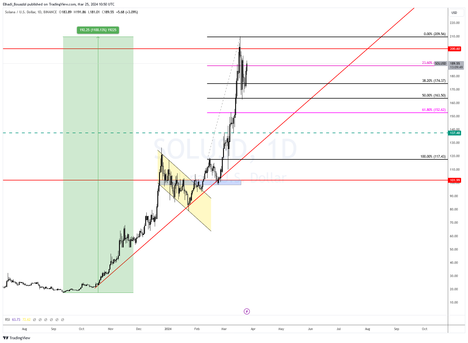 عملة سولانا SOL كانت عروس سوق العملات الرقمية في الأشهر الماضية. و التفاؤل نحوها أقوى من أغلب العملات الرقمية البديلة أخرى. و يمكننا ملاحظة ذلك في خط الاتجاه الصاعد، الذي بدء في نهاية سبتمبر الماضي بنشبة ارتفاعا تزيد عن 1000%.