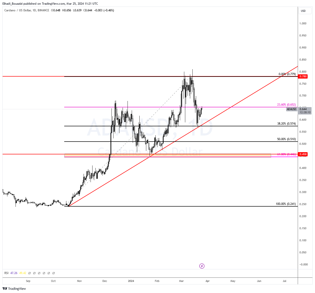 الموجة التصحيحية لعملة كاردانو ADA كانت أقل حدة من العملات الرقمية السابقة الذكر، حيث توقفت عند مستوى فيبوناتشي 38.2 عند سعر 0.570 دولار. أين لامس السعر أيضا خط الاتجاه الصاعد الذي بدا أكتوبر من العام الماضي.