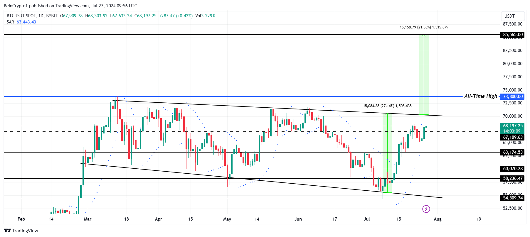لكن هذا قد يساعد بيتكوين على اختراق أعلى مستوى لها على الإطلاق والذي يبلغ 73,800 دولار. بينما كانت BTC قد شهدت أسبوعًا متقلبًا، فهي تتداول حاليًا عند 68,197 دولار، فوق الدعم الحرج البالغ 67,100 دولار. الارتداد من هنا قد يرسل الأصل الرقمي لكسر النمط.