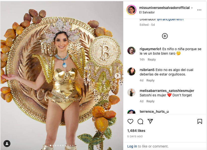 في 11 يناير 2023، جرت إحدى الأحداث التمهيدية لاختيار ملكة جمال الكون القادمة 2023. سار المرشحون في أزياء تمثل ثقافاتهم. واختارت السلفادور إبراز شعار البيتكوين ₿، بالإضافة إلى مجموعة متنوعة من العملات التي اعتمدتها الدولة.
