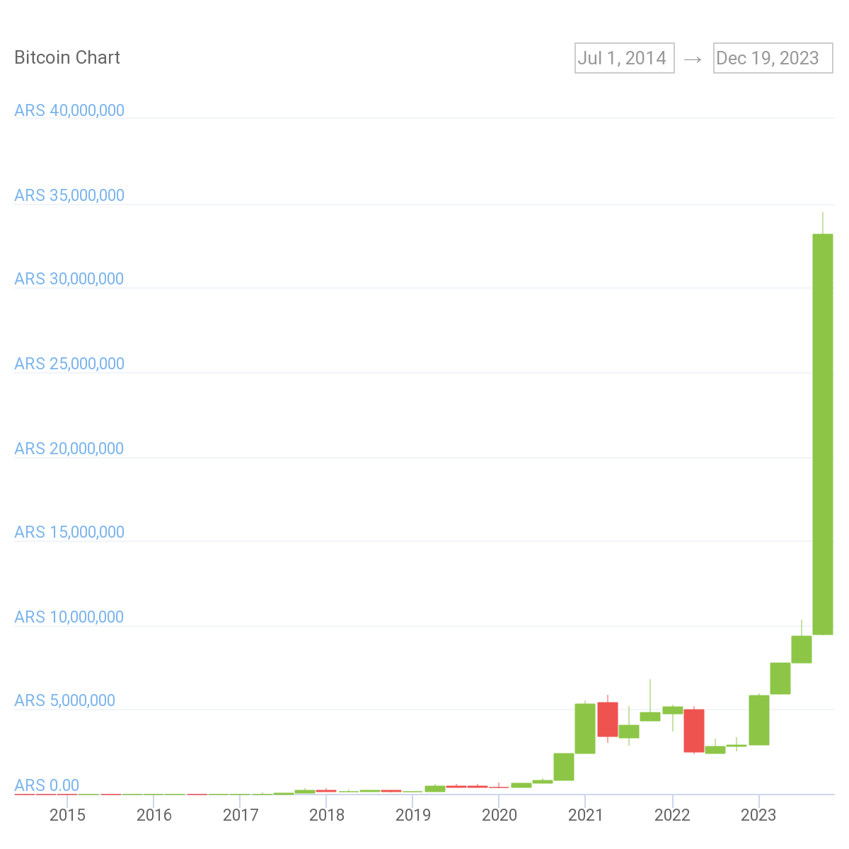 لكن الحقيقة المثيرة للاهتمام من التغريدة كانت حول البيزو الأرجنتيني. في وقت النشر الأولي، كانت قيمة بيتكوين واحدة تساوي 15,176,100 بيزو أرجنتيني. ومع ذلك، بعد تخفيض قيمة العملة في الأرجنتين، ارتفعت بأكثر من 100% مرة أخرى لتصل إلى مستوى قياسي جديد يبلغ 33,677,222 بيزو أرجنتيني.