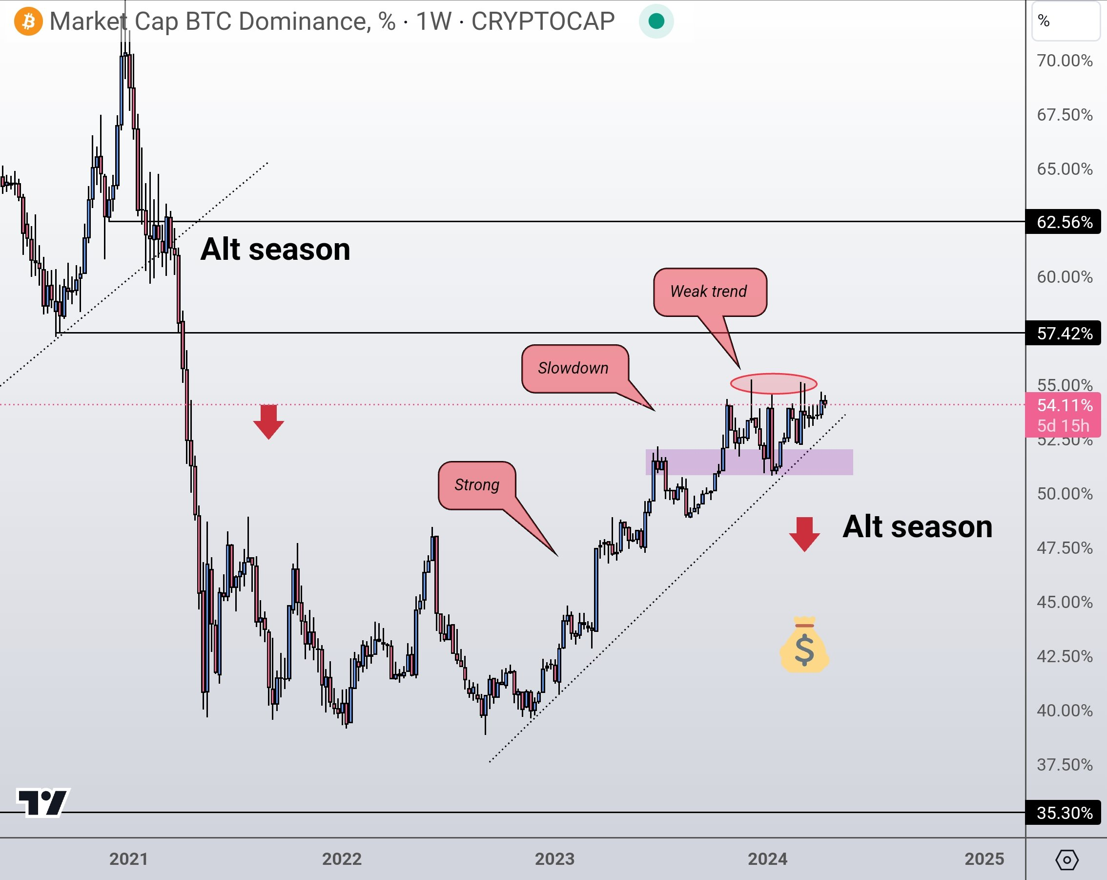 تُستخدم الرسوم البيانية للقيمة السوقية ومقاييس هيمنة البيتكوين كمؤشرات للمحللين الذين يتوقعون متى قد تبدأ العملات الرقمية البديلة في موسم الصعود. ومع ذلك، فقد قامت معظم العملات الرقمية البديلة بالتصحيح مؤخرًا بعد ارتفاعات منتصف مارس، في حين لا تزال البيتكوين بالقرب من ذروتها القياسية التي تجاوزت 70,000 دولار.