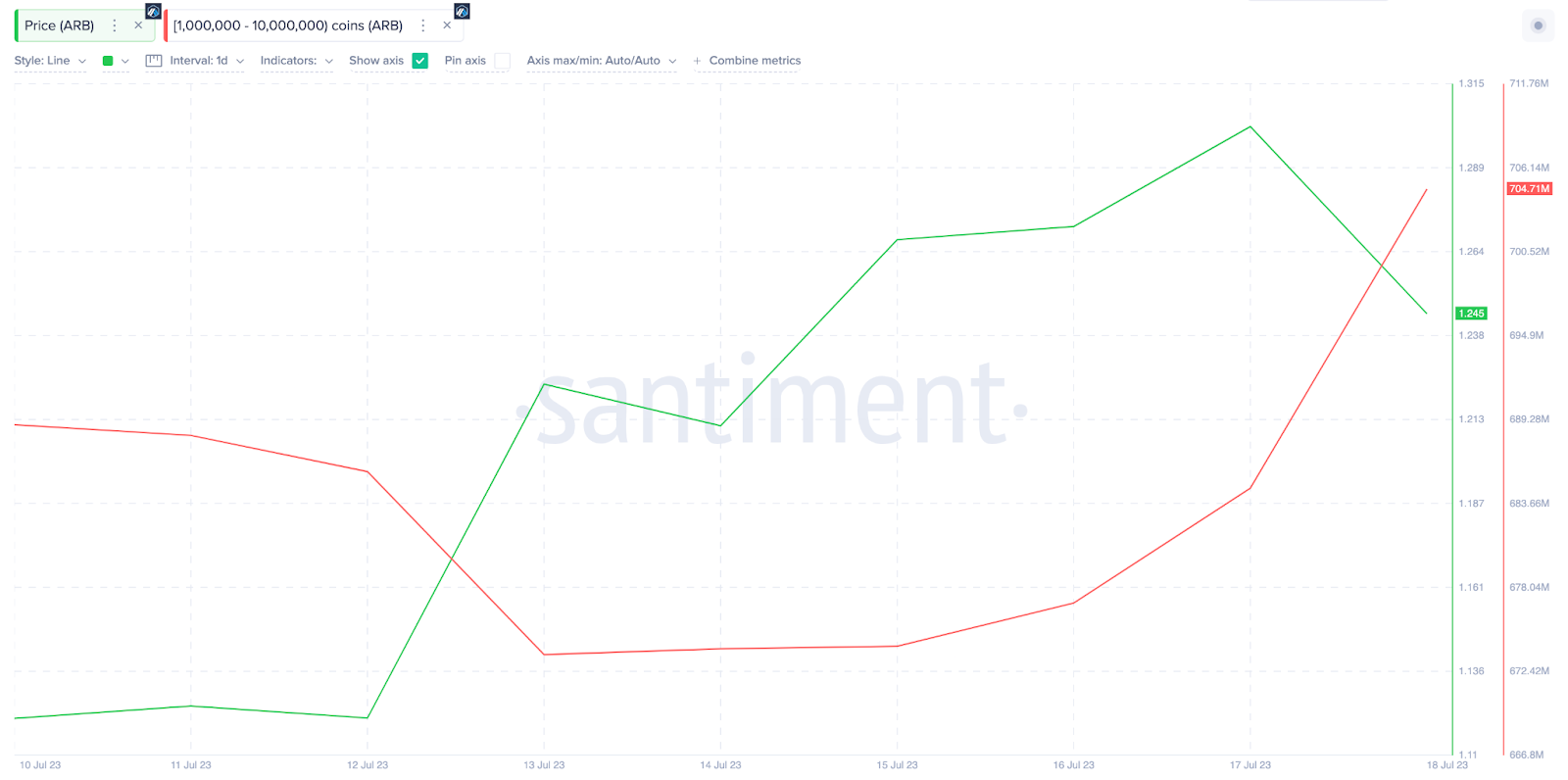 كما هو موضح أدناه، ففي الفترة بين 13 يوليو و 19 يوليو، أضافت الحيتان التي تمتلك مليون إلى 10 ملايين نحو 31 مليون من عملات ARB. وبالسعر الحالي البالغ 1.25 دولار، تبلغ قيمة الاستثمار الجديد نحو 38.8 مليون دولار.