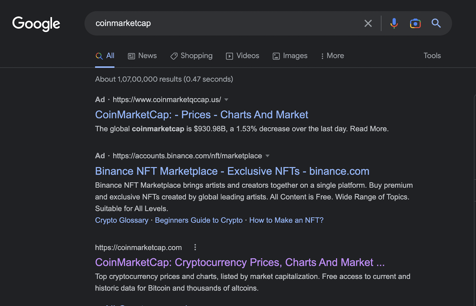 في واقعة تثير إلى الاستغراب يقدم موقع جوجل نتائج بحث لمواقع خاصة بالتصيد الاحتيالي للعملات المشفرة، عند البحث عن موقع منصة CoinMarketCap.