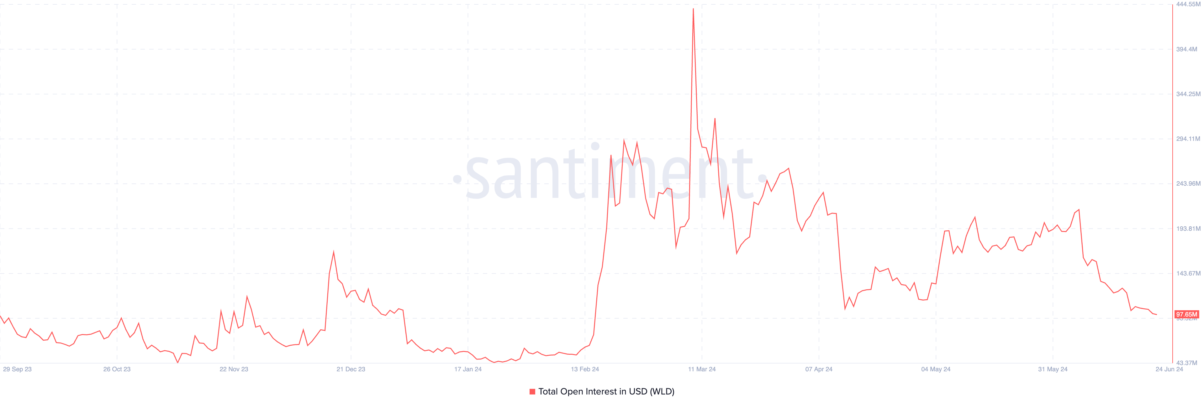 كان الاهتمام المفتوح الإجمالي لـ WLD 98 مليون دولار وقت كتابة هذا التقرير. وقد شهد اتجاهًا نزوليًا منذ أن وصل إلى أعلى مستوى له على الإطلاق والذي كان 440 مليون دولار في 9 مارس. وقد انخفض هذا الشهر بنسبة 51%.