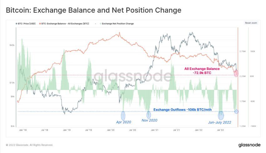 وبحسب بيانات منصة Glassnode فقد سحب المستثمرون عملاتهم المعدنية بمعدل بلغ 106.000 خلال شهر كما حدث مثل هذا الأمر في التدفق الخارجي الخاص بالبتكوين على مدار 3 مرات وهم؛ أبريل 2020، ونوفمبر 2020، ويونيو - يوليو 2022.