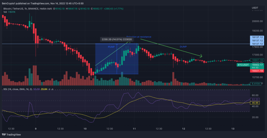 وفيما يخص سعربيتكوين BTC فقد تم الضخ له ليظل إيجابي على مدار 12 ساعة بعد إصدار السعر في العاشر من نوفمبر، وسجل سعر الأصل المشفر ارتفاع قدره 14% ولكن سريعاً ما بدأ السعر في الانزلاق بعد مواجهة الرفض عند نطاق 18.120 دولار.