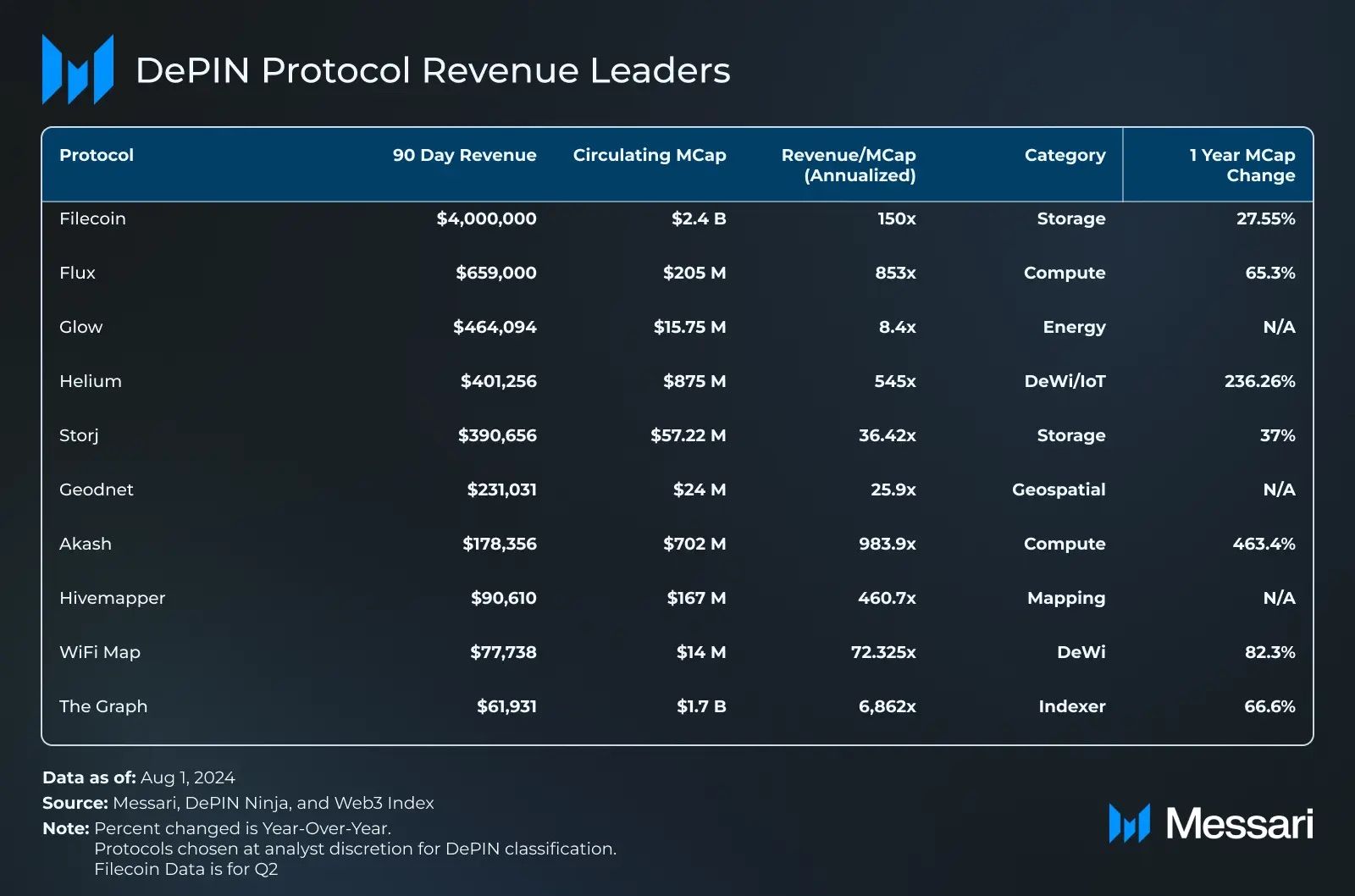 ومع ذلك، وعلى الرغم من النمو المذهل في القيمة السوقية، تواجه DePin تحديات كبيرة في الإيرادات. وفقًا لتقرير Messari، بينما ارتفعت التقييمات بشكل كبير، تتأخر الإيرادات بشكل كبير، حيث تتصدر أربعة فقط من أكبر بروتوكولات DePin الثمانية في الإيرادات.