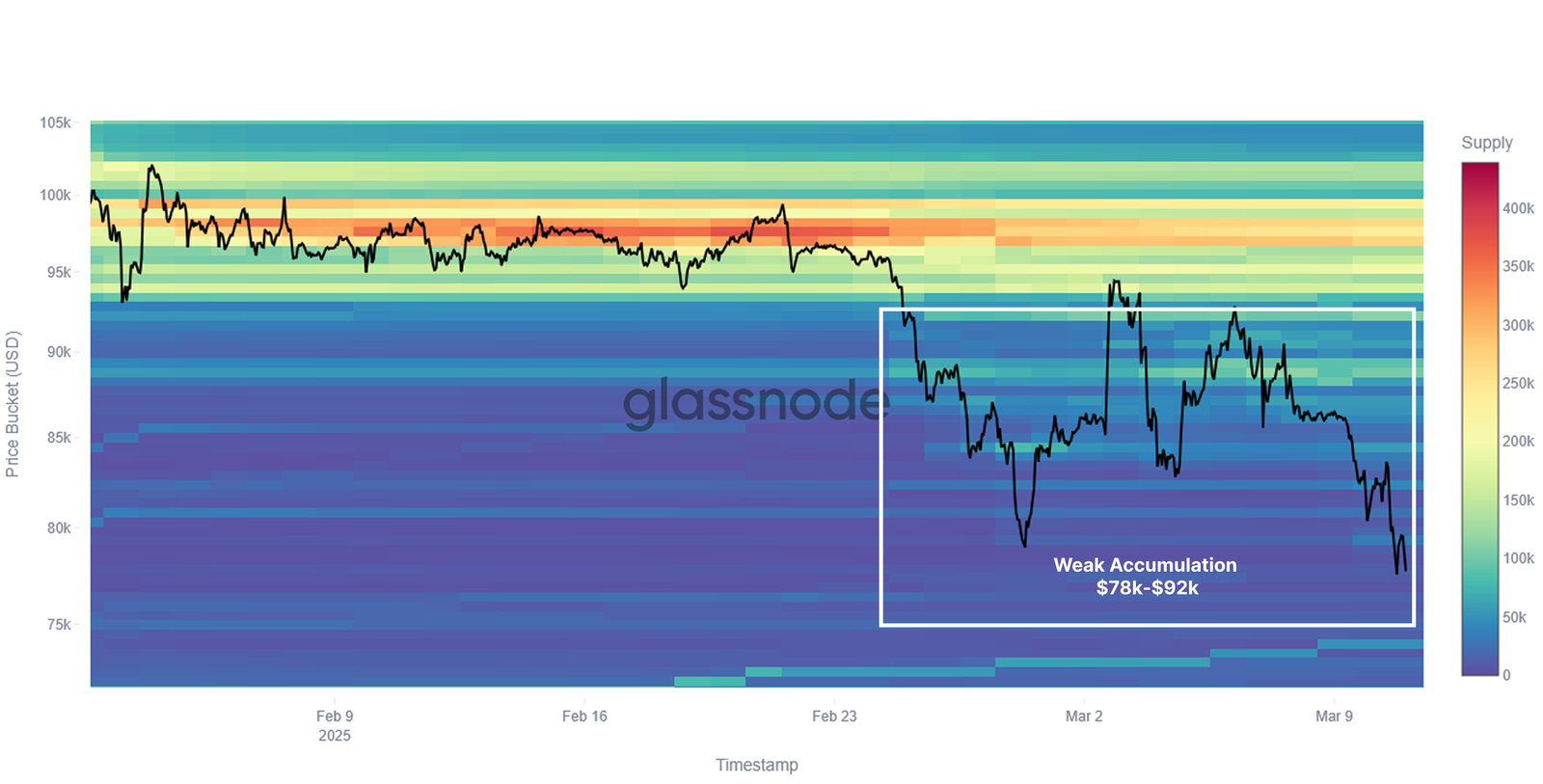 اللافت هذه المرة هو غياب عمليات الشراء النشطة عند الانخفاض، التي كانت سمة مميزة في التراجعات السابقة. يظهر ذلك جلياً في خريطة التوزيع الحراري لـ "غلاسنود"، التي تُظهر ضعفاً في الطلب. في ظل تصاعد المخاطر الخارجية مثل اختراق منصة "بايبت" (Bybit) وتوترات الرسوم الجمركية الأميركية..
