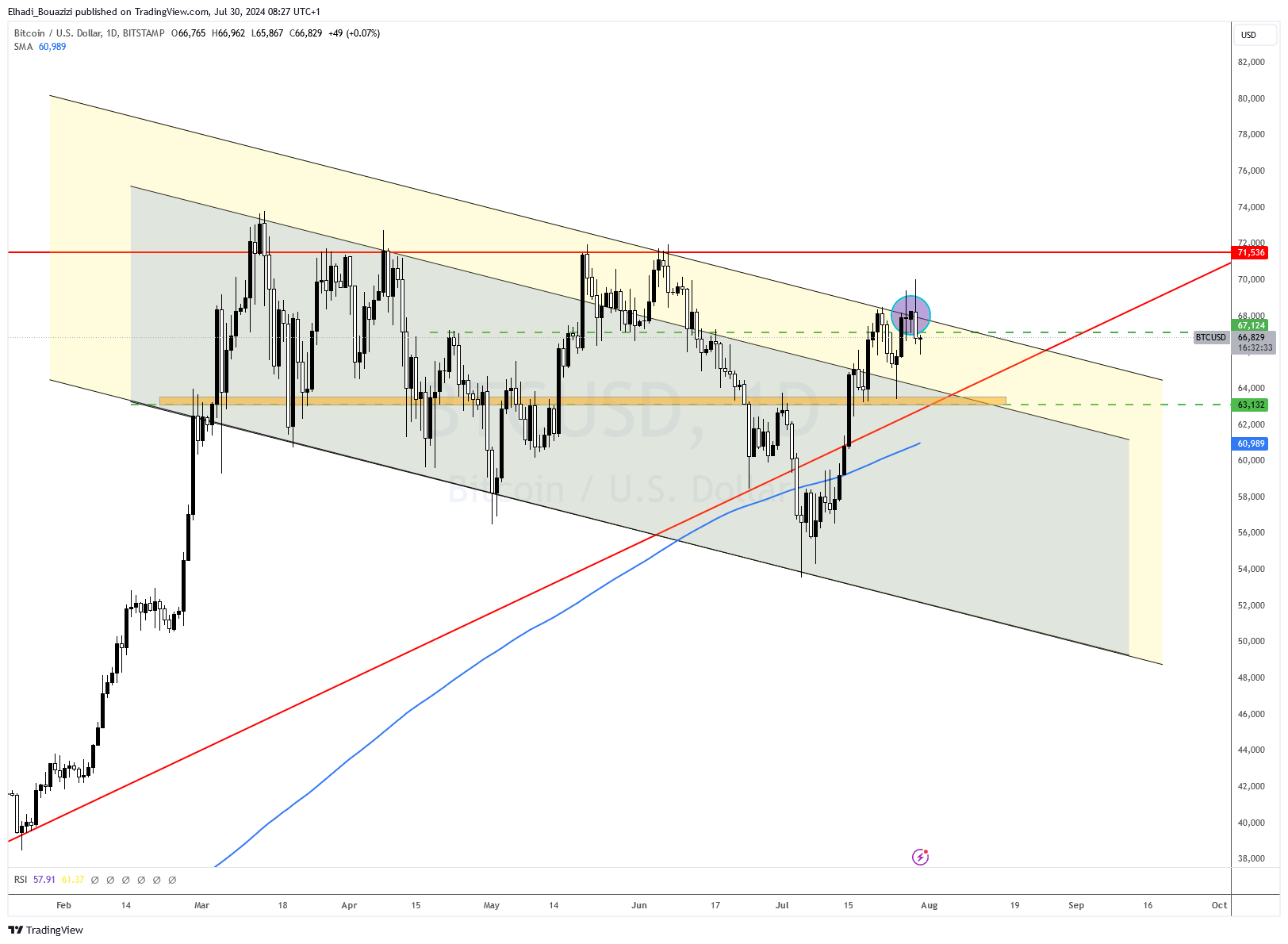 يبدو أنني تسرعت قليلا في تحليل يوم أمس عندما قلت أن سعر البيتكوين BTC قد اخترق الحد العلوي للقناة السعرية الهابطة. فالتحركات مساء أمس القوية، دفعت الشمعة اليومية للإغلاق تحت مستوى المقاومة 67,100 دولار.