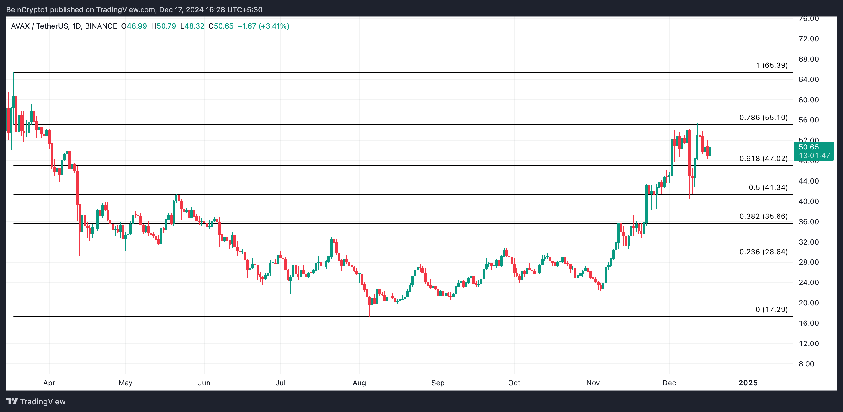 يتداول AVAX عند $50,65 وقت النشر، محلقًا فوق الدعم عند $47,02. إذا ظل رد فعل السوق حول ترقية Avalanche9000 ضعيفًا، فقد يختبر سعر العملة هذا المستوى من الدعم. قد ينخفض سعر AVAX إلى $41,34 إذا فشل في الثبات.