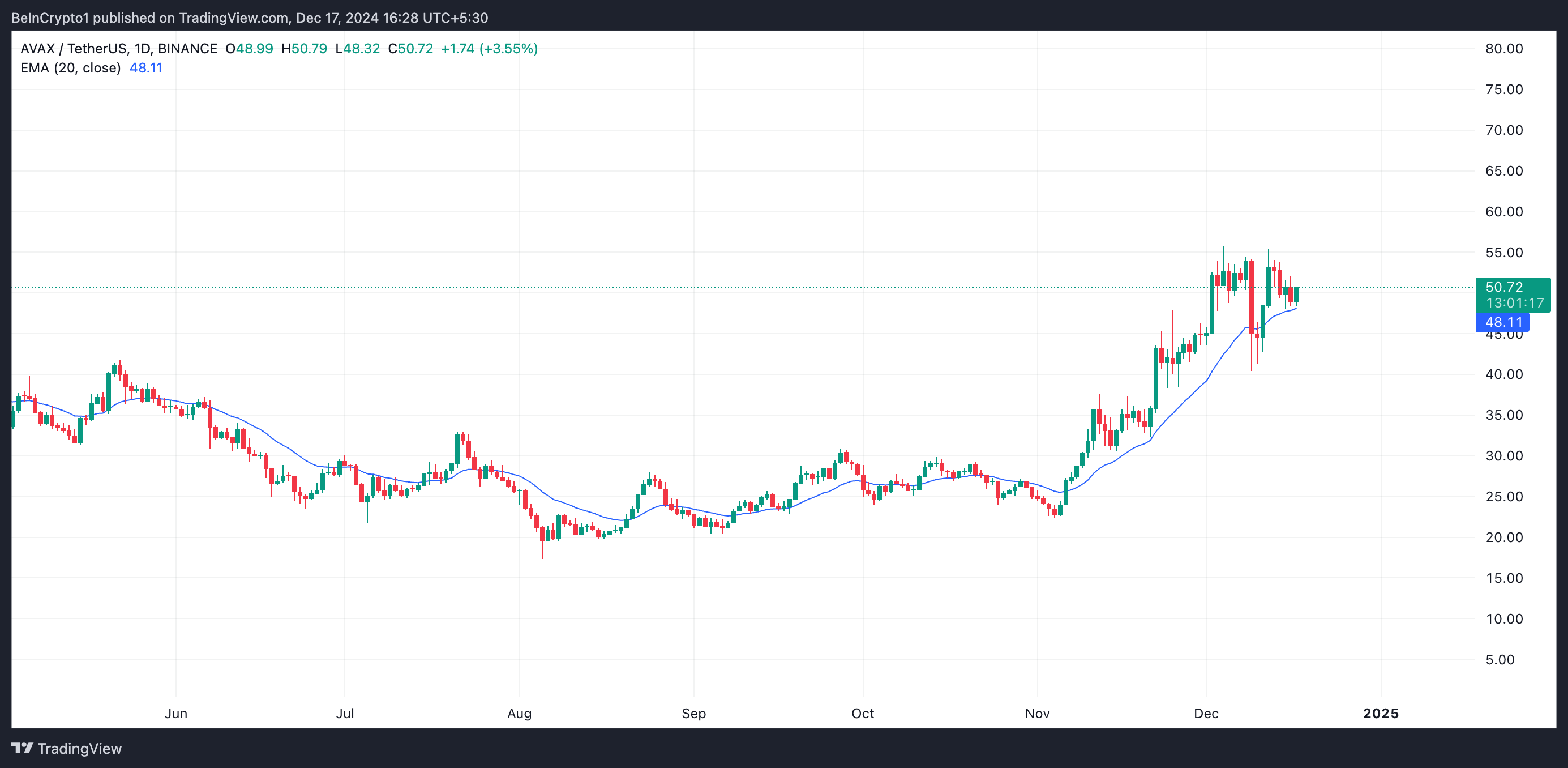 علاوة على ذلك، يُظهر تقييم مخطط AVAX/USD ليوم واحد أن العملة مستعدة للهبوط تحت متوسطها المتحرك الأسي لـ20 يومًا (EMA). يقيس EMA لـ20 يومًا متوسط سعر الأصل خلال الـ20 يومًا الماضية، مع إعطاء وزن أكبر للأسعار الأخيرة.