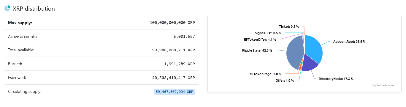 تُظهر XRPScan أن هذه 5 ملايين عنوان تحتوي مجتمعة على 99,988,008,711 رمز XRP. منها 40,508,410,417 رمز XRP حاليًا في الضمان، مما يترك حجم المعروض المتداول قدره 59,467,607,004 رمز XRP بقيمة سوقية تبلغ 30.97 مليار دولار.