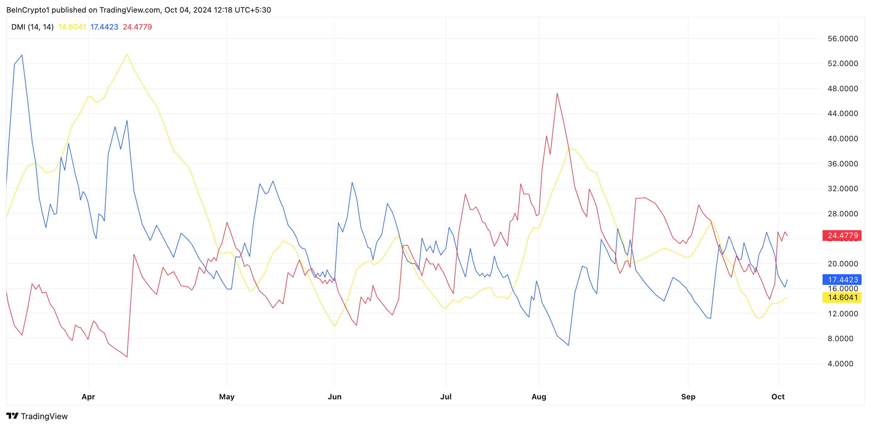 Sponsoredعلاوة على ذلك، تقييم ضغوط الشراء والبيع في سوق TON يكشف عن توازن القوى لصالح الدببة. قراءات من مؤشر الحركة الاتجاهية (DMI) للعملة، الذي يقيس القوة، تظهر مؤشر TON الاتجاهي الإيجابي (الأزرق) أقل من مؤشره السلبي (الأحمر).